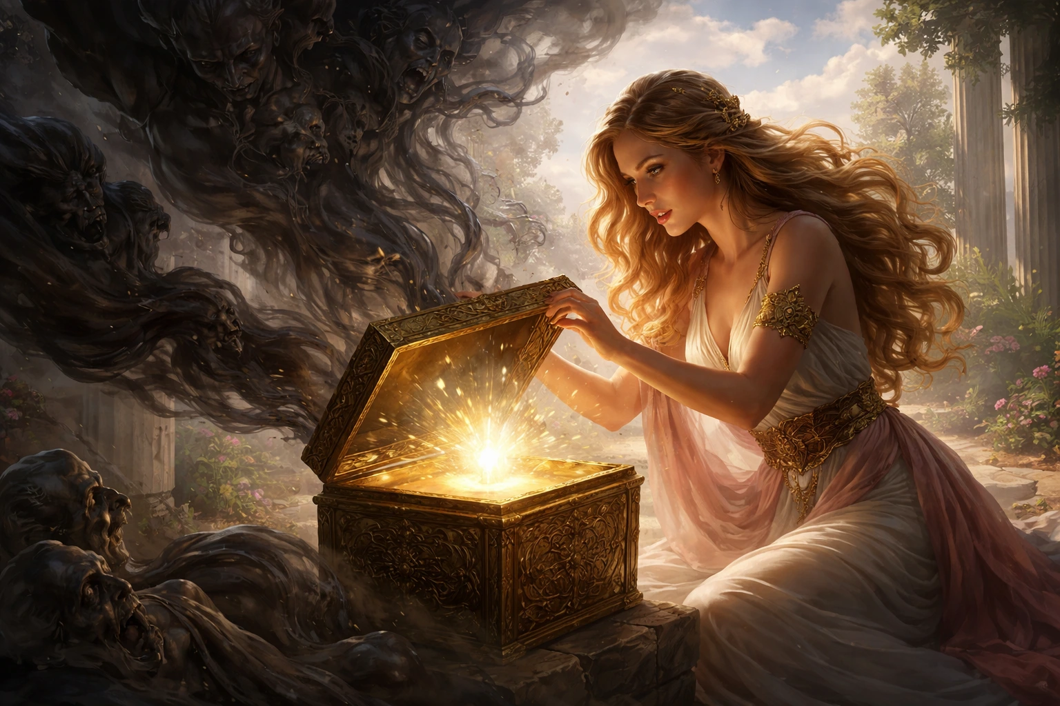 Zeus orders the gods to create Pandora. She’s “all-gifted”—beauty, charm, skill, and a mind that can’t stop wondering. In Hesiod’s telling, multiple gods contribute to her making, like a divine team building a masterpiece with consequences baked in.