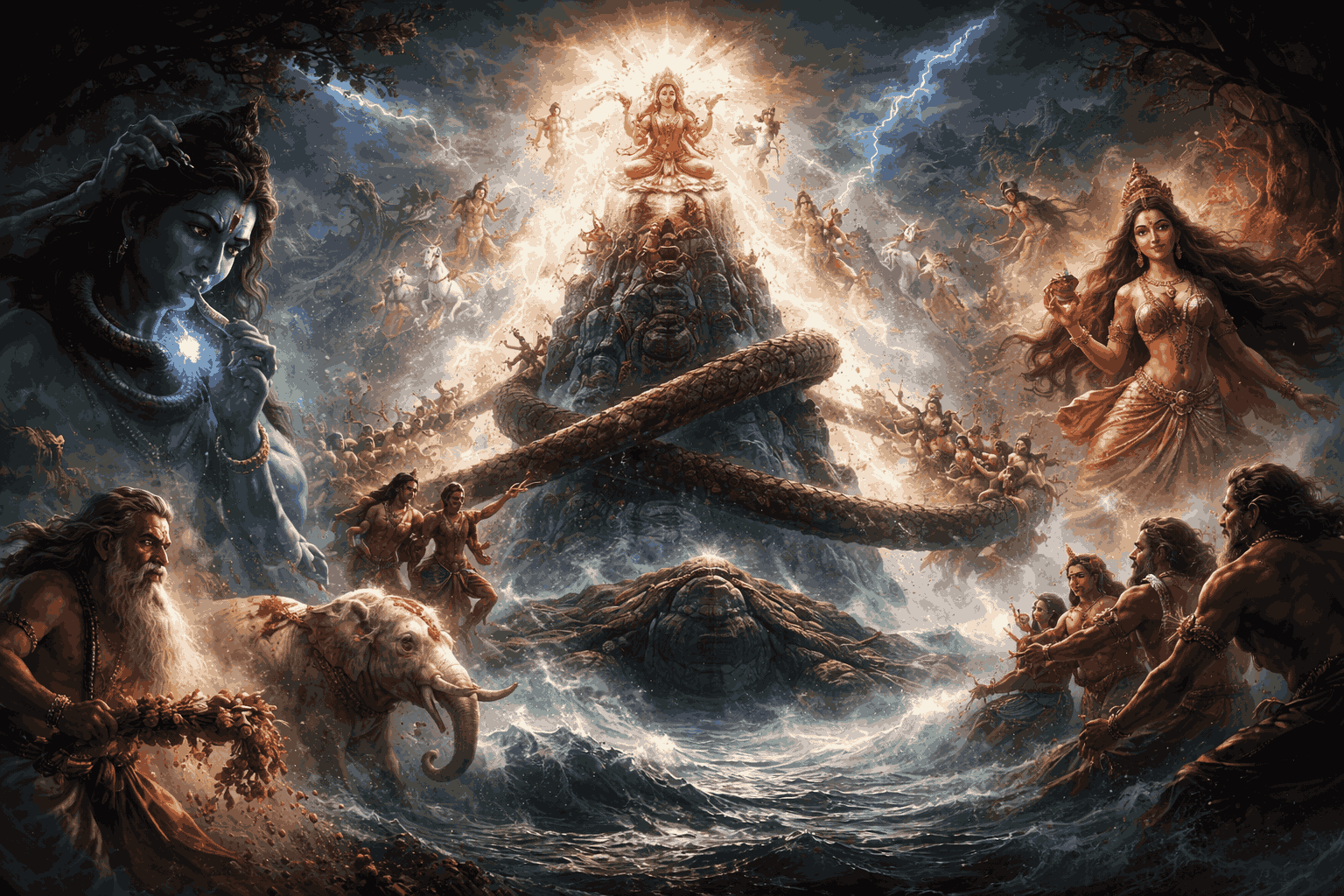 Different traditions list different “treasures,” but many popular tellings include items and beings that become symbols in their own right—such as Lakshmi (prosperity), the celestial horse Uccaihshravas, and Dhanvantari (divine physician) bearing the nectar.
