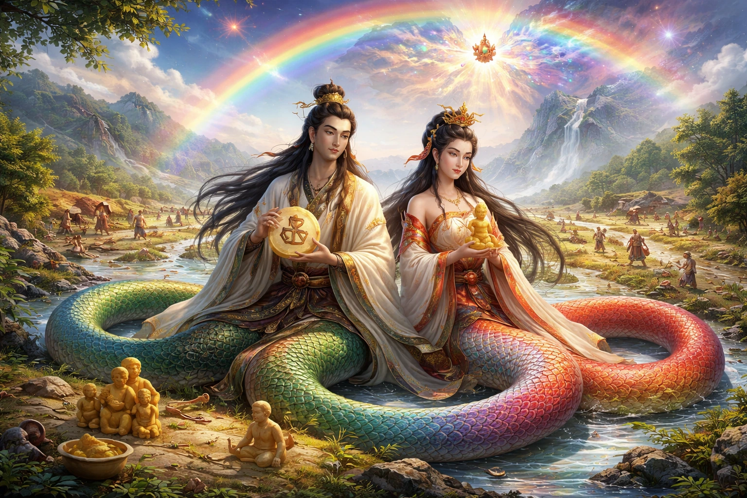 In one Chinese mythology tradition, two serpent-bodied siblings stand in the quiet after catastrophe and decide the next chapter of humanity won’t happen by accident. It will be shaped—by hand, by mud, and by rules that turn survival into society.